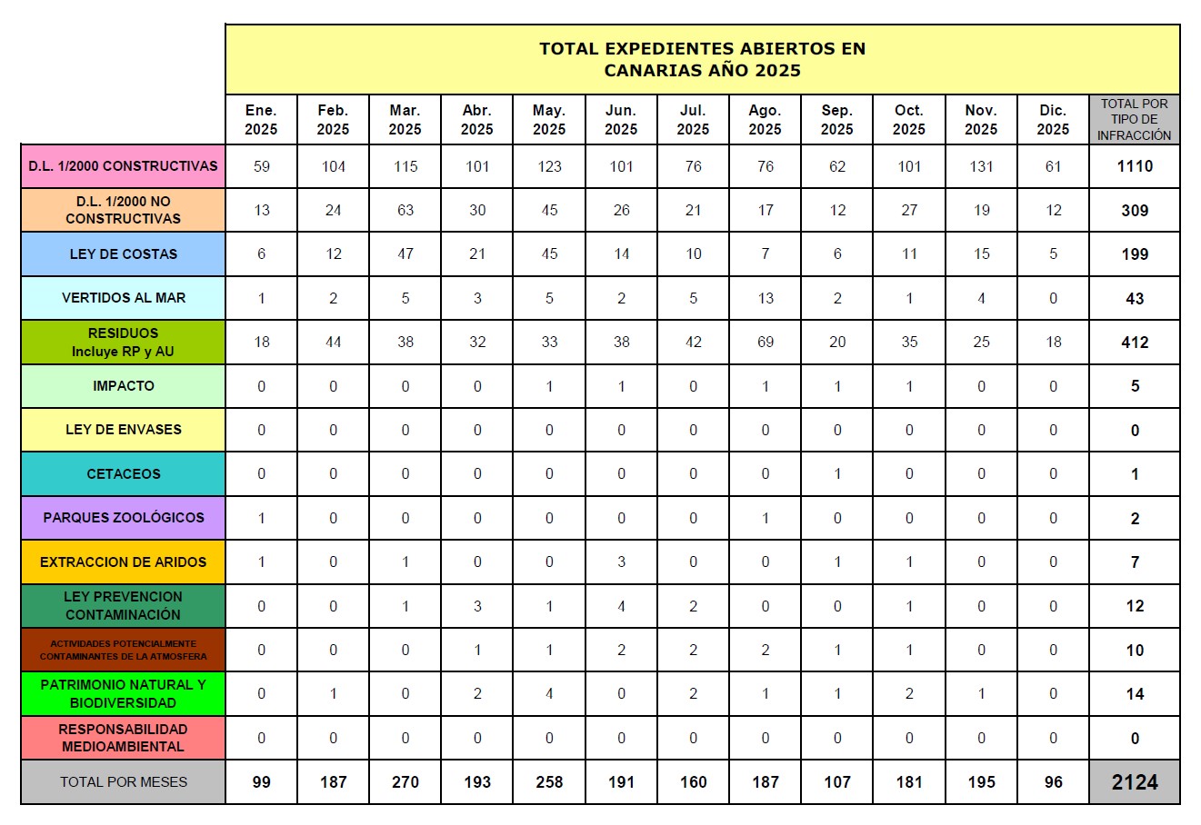 Expedientes abiertos en Canarias en el año 2025 por tipo de infracción: